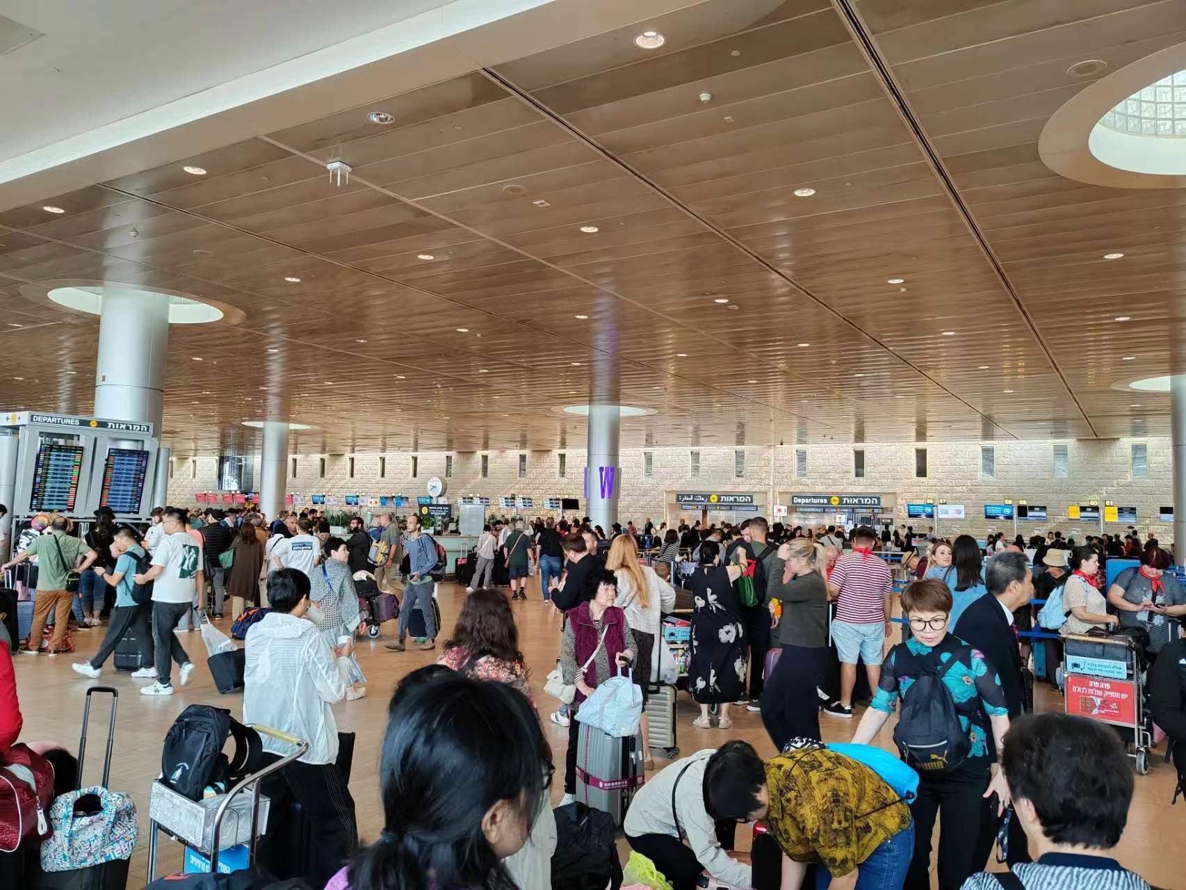10月10日一早,老李和太太按计划随大部队前往特拉维夫机场。“去机场的路上还是挺安全的,到了机场并没看到网上说的骚乱,但机场里的人还是很多,不少航班被取消的旅客也只能呆在机场里等待。”