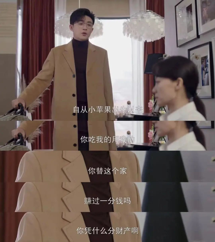 成为全职主妇以来,林双每天的行程都很满,早起给老公、女儿做饭,接送女儿上下学,晚上洗衣做饭、陪女儿入睡。可以说,林双的每一刻都属于这个家庭。然而,卫明一直认为林双能过上衣食无忧的生活,都是靠自己辛苦工作赚来的,却避而不谈林双为家庭的牺牲和付出。卫明提出离婚时说:“自从小苹果(女儿)出生以来,你吃我的、用我的,你替这个家赚过一分钱吗?你凭什么分财产啊?”
