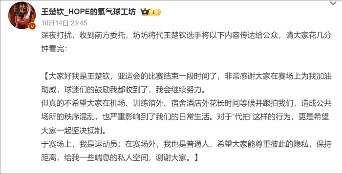 近日,国乒球员王楚钦在机场被跟拍怒怼“粉丝”的视频在网上热传。“希望大家能尊重彼此的隐私,保持距离,给我一些喘息的私人空间。”10月14日深夜,王楚钦发布声明,希望球迷能够理智看待运动员,一起抵制长时间跟拍和“代拍”等饭圈行为。