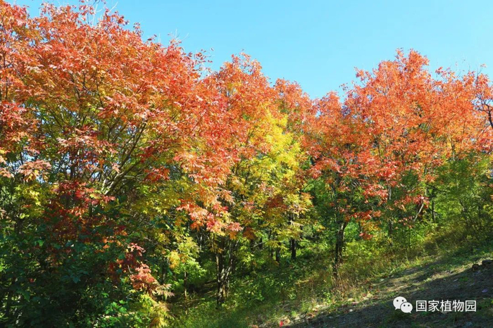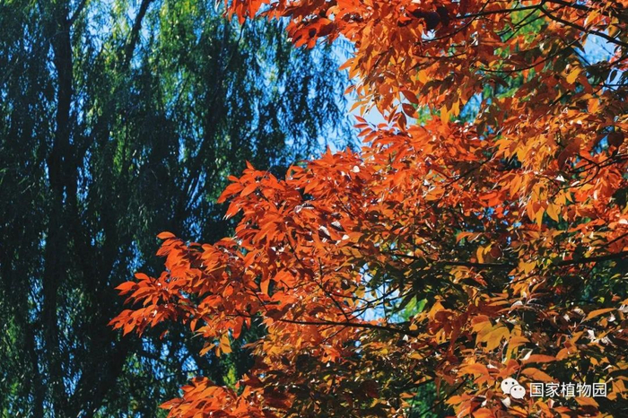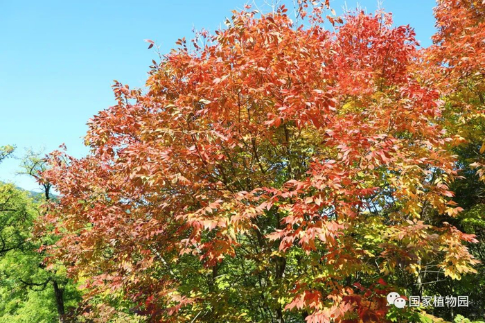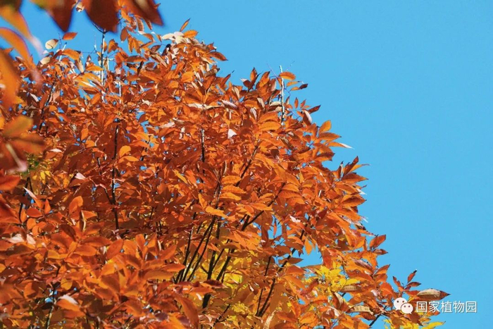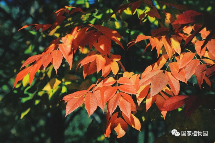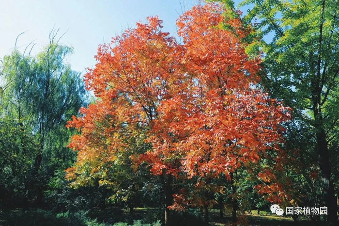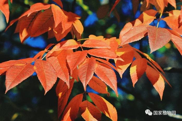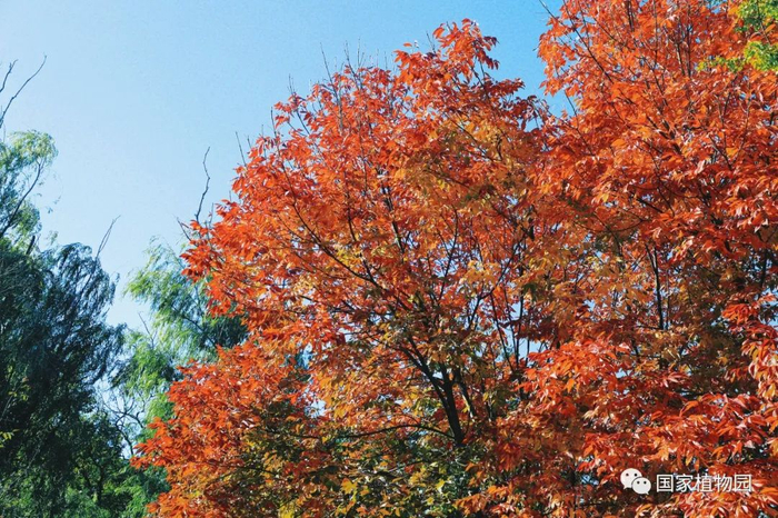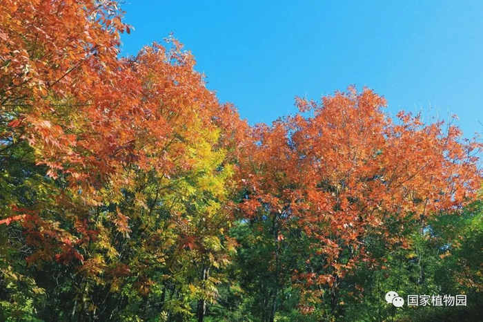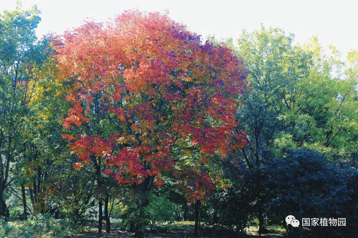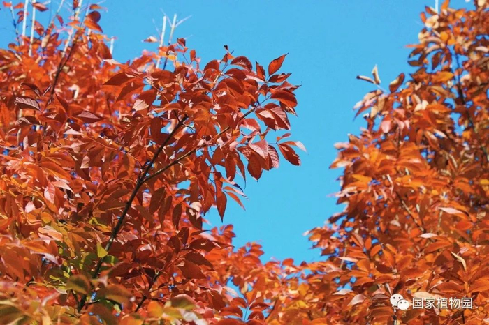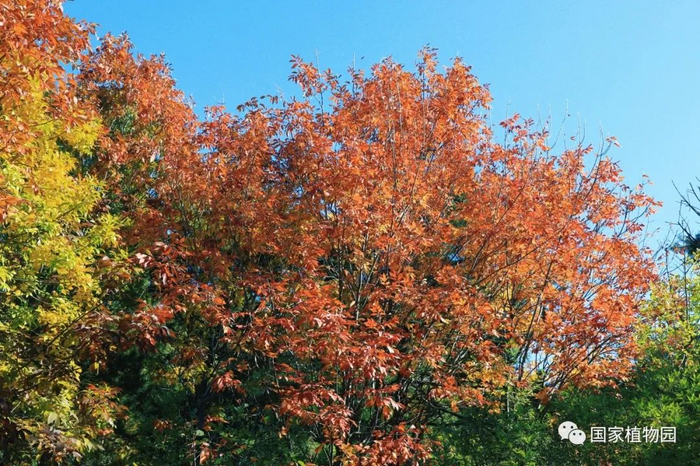 国家植物园除了栽植有最引人注目的秋紫白蜡之外,还栽植有“秋欢”“秋火”等其他多个品种。每到秋季,他们开始陆续变色,与金枝槐、元宝槭、栾树等彩叶树种交相辉映,展现了独属于秋的斑斓色彩。