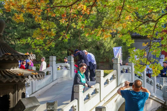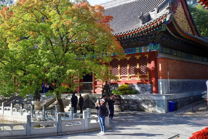 “清幽专线”——来到位于公园北门外的碧云寺景区,远离园内熙攘的人群,看这里红墙为布、地锦为台,古老的寺庙景区内高大、金黄的银杏,衬着建筑的一隅、衬着屋脊的角兽、衬着屋檐的瓦当,自带柔和宁静的滤镜,格外古朴和清幽。