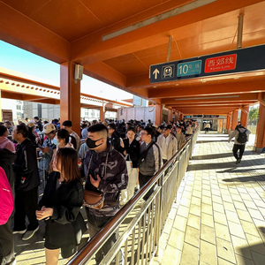 不过,今早记者在西郊线上乘车时注意到,由于游客数量猛增,从8点半开始西郊线列车就已经是趟趟满员,从巴沟站排队进站也要费一番周折,地铁10号线巴沟站采取了出站限流措施,引导乘客从远端出口出站,然后绕一大圈进去西郊线巴沟站,队伍已经排到了人行步道上,西郊线也采取了限流措施,在检票闸机处有工作人员值守。记者实地体验后发现,从10号线出站再换乘进入西郊线用时在20到30分钟。