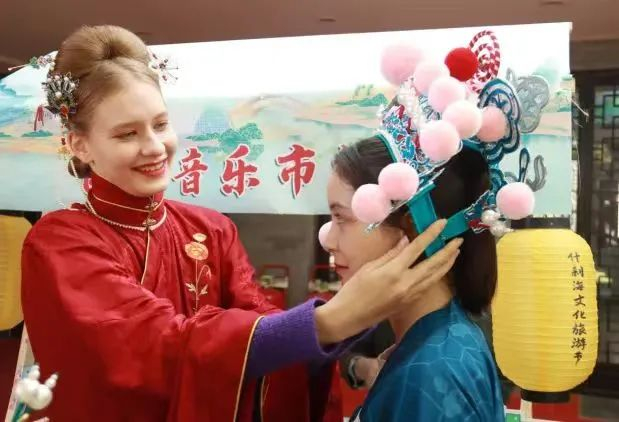 在古筝、二胡、琵琶、竹笛,共奏琴乐和鸣之声中,宫灯、毛猴、风筝、面塑、刺绣等非遗传承人展示高超技艺,与现场观众一起体验非遗制作的乐趣。书法老师现场创作,挥毫泼墨,将美好的“福”字传赠,深受大家喜欢。市集还设立了国风打卡区,游览者可试穿国风服饰,绘制国风妆容,现场体验到国风元素的无限魅力。
