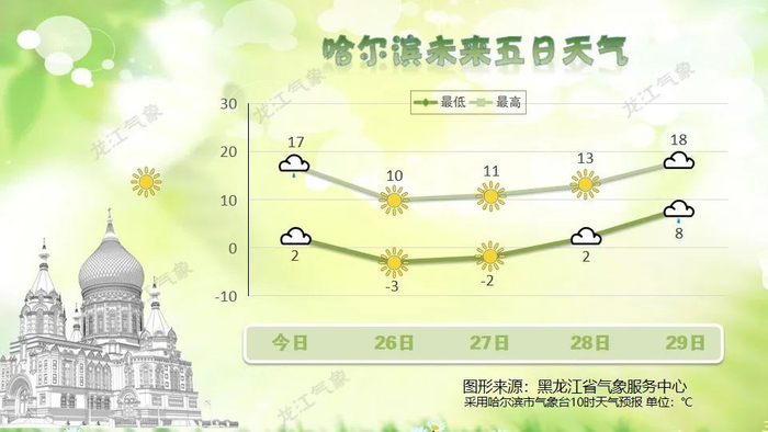 25日夜间最低气温:大兴安岭、黑河北部-7~-5℃,黑河南部、伊春、哈尔滨北部-3~-1℃,佳木斯、鸡西、牡丹江3~5℃,其它地区1~3℃。