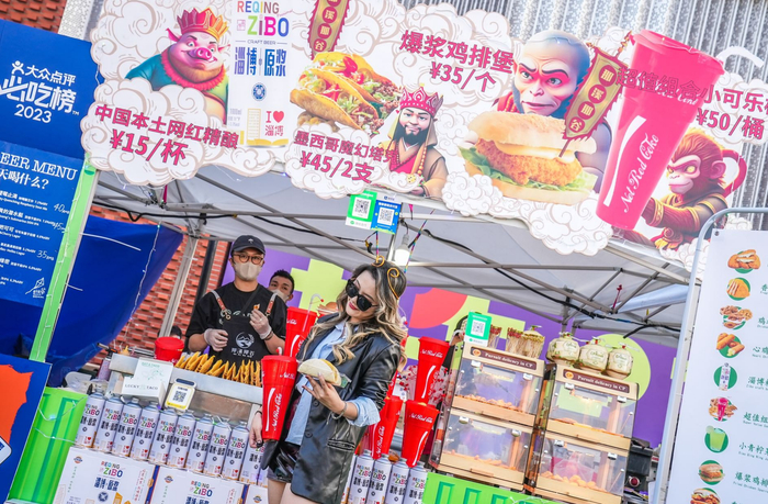 除了当下热门潮流的各式汉堡,精酿、咖啡等饮品品牌也集中亮相。在一家售卖炸鸡、炸薯条等小吃的摊位,成排的“淄博精酿”啤酒桶,吸引不少过往游客跃跃欲试。“味道挺不错,下次拿去搭配淄博烧烤吃。”两名年轻消费者品尝后,说着便扫码买了两桶。