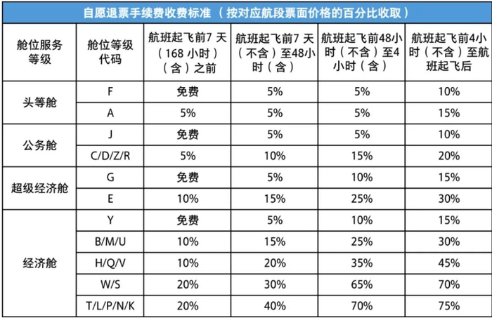 旅客在办理自愿退改手续的时间段不同、航位等级不同,退改手续费收费标准也不一样。执行新的标准后,旅客办理自愿退票的手续费最高为票面价格的75%,办理自愿变更的手续费最高为票面价格的60%。