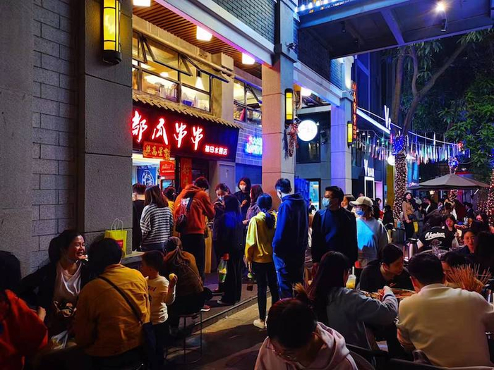 木屋烧烤品牌合作方深圳市领合商业运营管理有限公司负责人陈先生对第一财经记者介绍,该店的食客主要以香港居民和年轻上班族为主,毗邻东门商业步行街,这里由于价格实惠,基本成为了大家宵夜打卡处,“每天生意十分忙碌,仅能根据当天的食材量限量开台接客。”