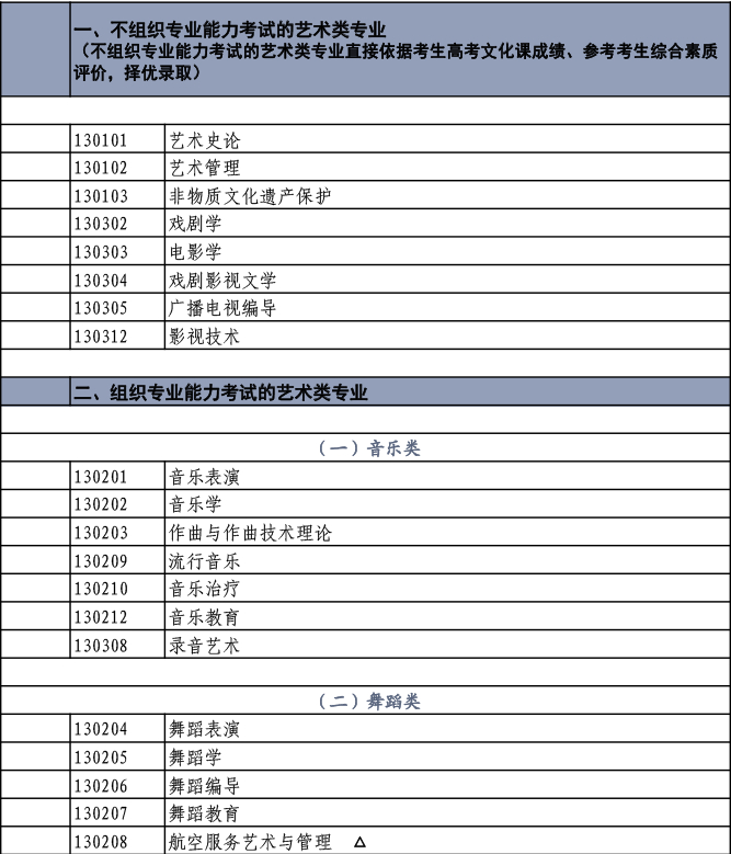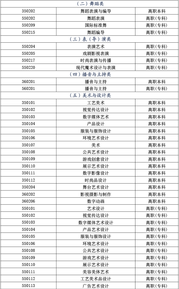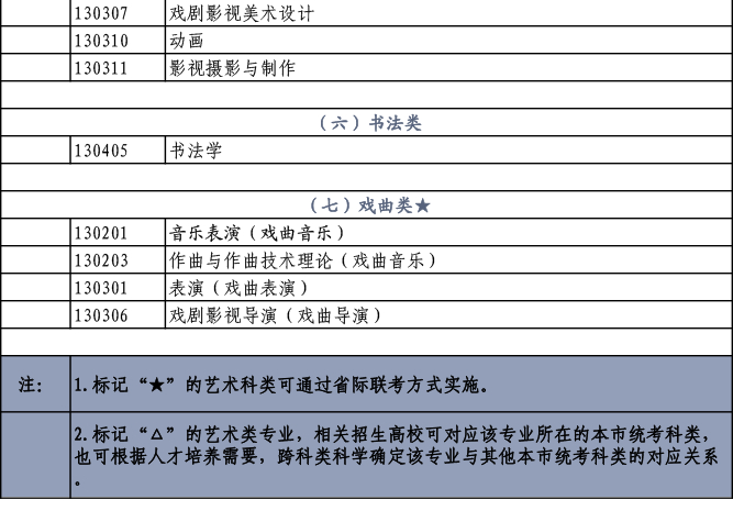 具体详见《普通高等学校艺术类考试招生本科专业目录》和《北京市高等职业教育艺术类考试招生本科和专科专业目录》。