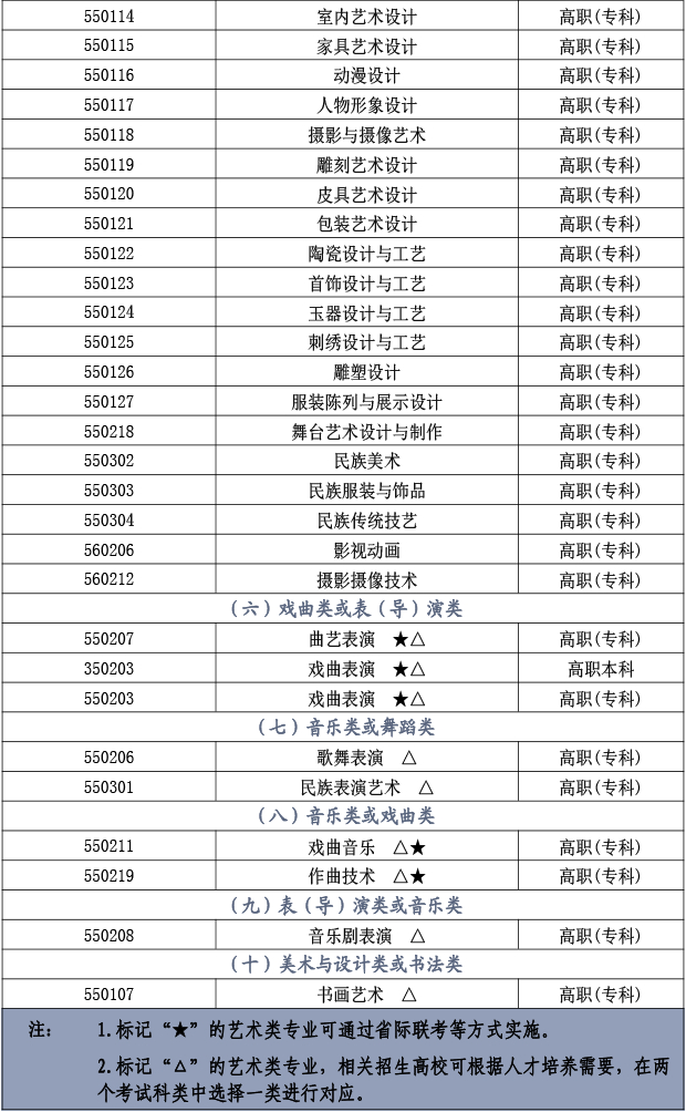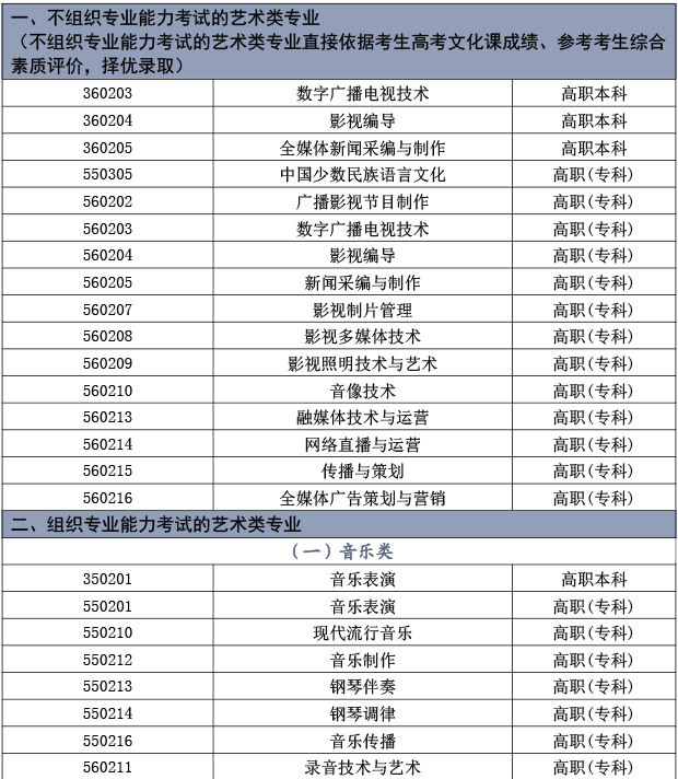 相关高等职业教育本科和专科艺术类专业招生高校,不再组织艺术类专业能力考试,须使用我市艺术类统考或戏曲类省际联考成绩录取。