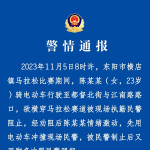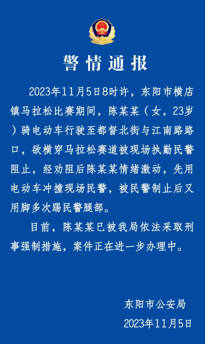 据浙江东阳市公安局11月5日晚通报,2023年11月5日8时许,东阳市横店镇马拉松比赛期间,陈某某(女,23岁) 骑电动车行驶至都督北街与江南路路口,欲横穿马拉松赛道被现场执勤民警阻止,经劝阻后陈某某情绪激动,先用电动车冲撞现场民警,被民警制止后又用脚多次踢民警腿部。