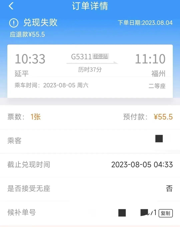 ● 兑现时,将根据您所候补列车的席位实际情况予以分配。