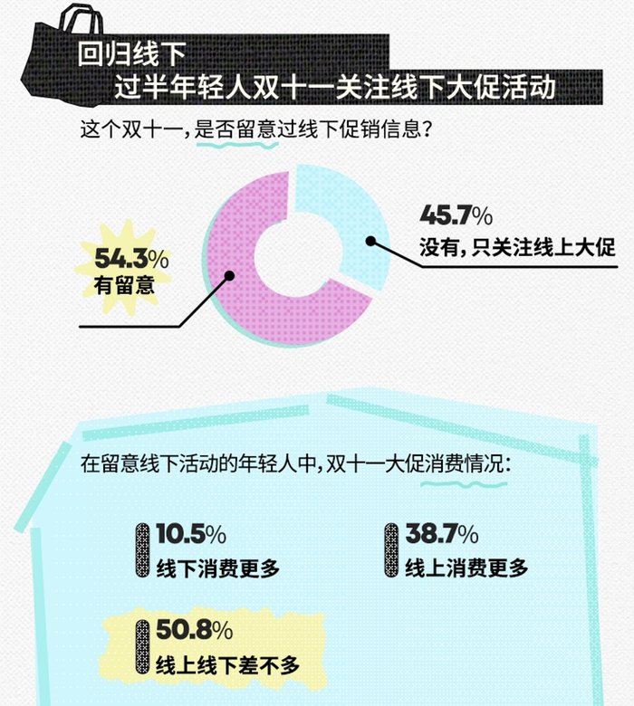 《2023 Z世代双十一消费行为报告》显示,有54.3%的年轻人留意线下促销信息,在这之中,有超6成的年轻人双11消费线下多于或持平线上。这一趋势在小镇青年群体中更为明显,7成关注到线下促销的小镇青年双十一消费线下多于或持平线上。