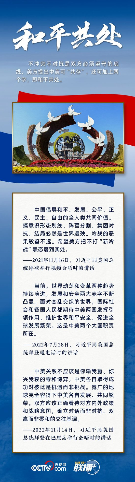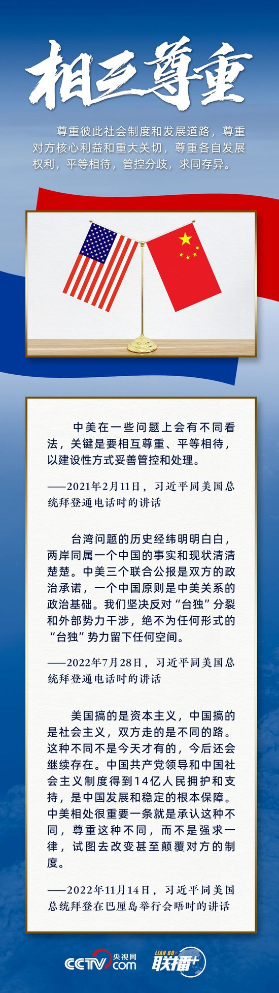 “中美不冲突、不对抗、和平共处,这是两国最基本的共同利益。”习主席指出,遵守国际关系基本准则和中美三个联合公报,这是双方管控矛盾分歧、防止对抗冲突的关键,也是中美关系最重要的防护和安全网。