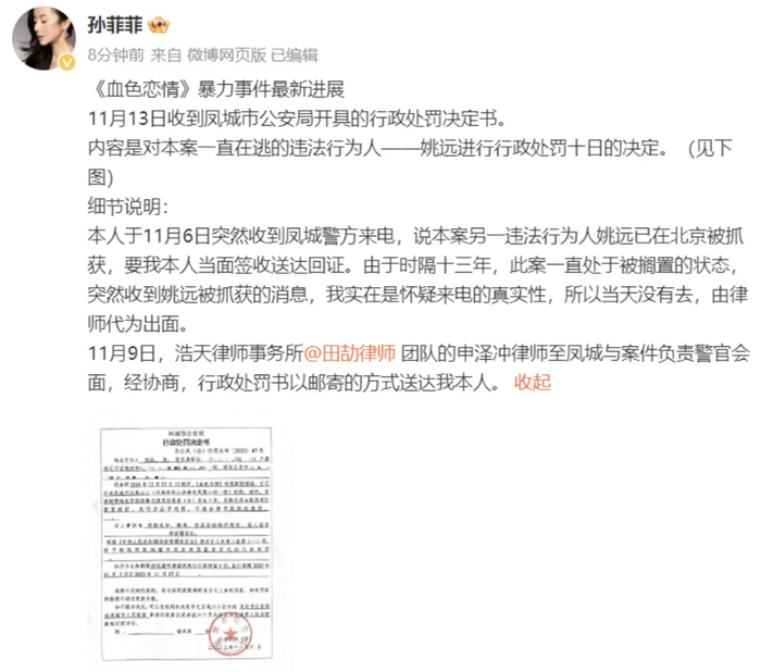 11月14日,女演员孙菲菲晒出自己遭遇的《血色恋情》剧组暴力事件最新进展:辽宁丹东凤城市公安局开具的行政处罚决定书显示,该局对姚某作出行政拘留十日并罚款五百元的决定。