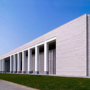 据了解,文博中心的工艺做法多样,仅装修确认的材料就达100多种。其中声闸墙面用槽孔吸音板、卫生间墙面用橙色陶板、剧场墙面用A级基层防火木饰面、剧场扬声器室用透声织物以及室外大面积汉白玉柱和雕刻额坊都属极为新颖的工艺做法。