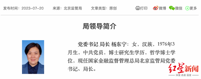 这11人之中,1976年出生的杨东宁最年轻,出任金融监管总局北京监管局党委书记、局长,曾为银监会新闻发言人。