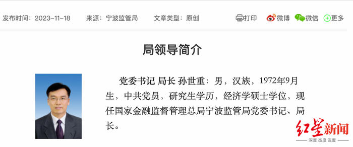 11月20日,国家金融监管总局宁波监管局局长已由覃刚变更为孙世重,此前孙世重为山东监管局党委委员、副局长。