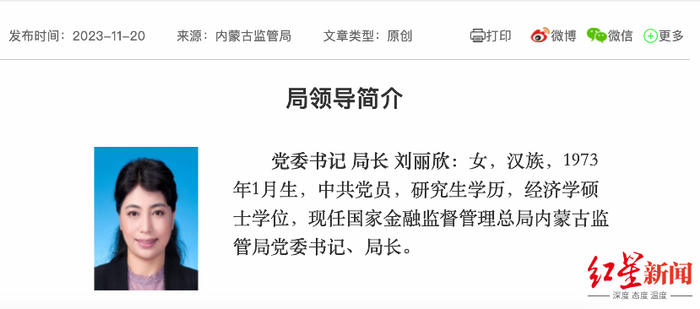 同日,内蒙古监管局网站更新的局领导信息显示,刘丽欣已任该局党委书记、局长。此前为山西监管局的副局长。更早之前,她曾担任原黑龙江银监局党委委员、副局长;后又出任原黑龙江银保监局党委委员。