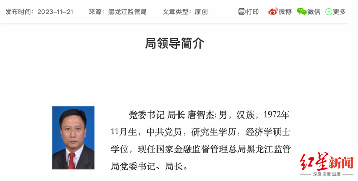 11月21日,现年51岁的唐智杰已出任黑龙江监管局党委书记、局长一职。此前为宁夏银保监局党委书记、局长。更早之前,他曾担任原湖南银保监局副局长,分管农村中小银行机构监管处、新型农村金融机构监管处、财务会计处工作。