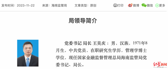 王吴庆曾是广东监管局党委委员、副局长。公开资料显示,他是在职研究生学历,管理学博士学位。并且是从广东“副局”升任至海南“局长”。