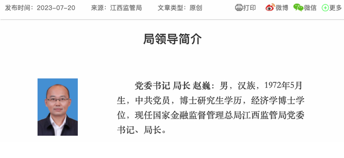 同日,赵巍已出任江西监管局党委书记、局长。此前,赵巍为新疆监管局党委书记、局长。据公开信息,赵巍,博士研究生学历,经济学博士学位。2019年3月,曾任原新疆银保监局党委书记、局长,后出任金融监管总局新疆监管局党委书记、局长。