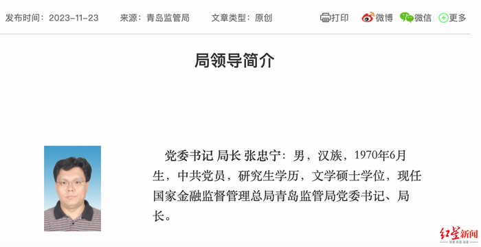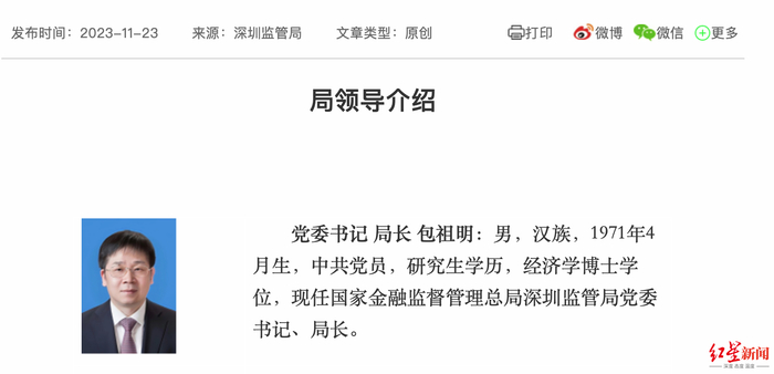 除了上述4地,11月23日也有三位新局长履新——包祖明已任深圳局党委书记、局长,此前担任浙江监管局局长;国家金融监管总局办公厅副主任张忠宁已出任青岛监管局局长;赵巍已出任江西监管局党委书记、局长,此前为新疆监管局党委书记、局长。