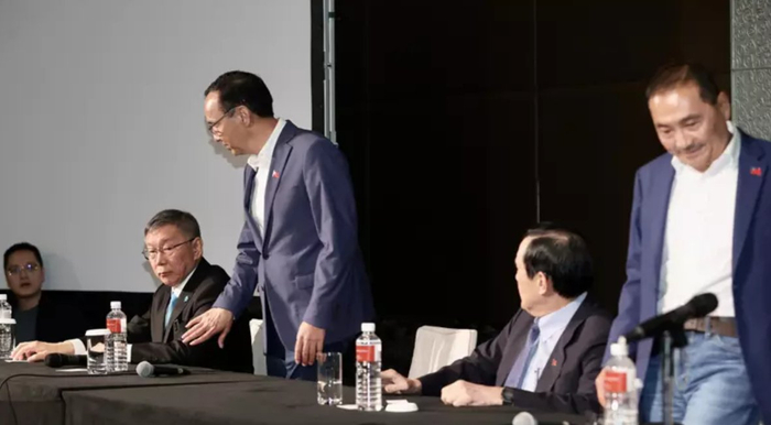 郭台铭一开始便以主持人的身份,礼貌质疑侯友宜,明明承诺只带一名幕僚前来(三方各带一名幕僚与会),却带了马英九和朱立伦两人同行。意思是,原先设定是三方单挑,为何侯摆出打群架的态势?侯友宜面带微笑频摇头,显然怒火中烧,因为侯无论去什么场合都要带“保母”,早有“巨婴”之讥,郭的质疑直戳要害,一旁的马英九和朱立伦也都尴尬不已。