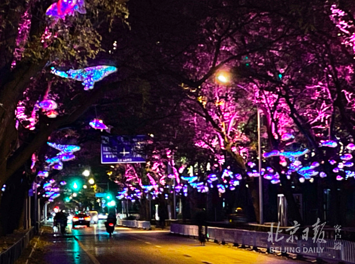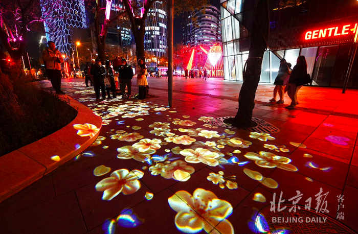 走在三里屯路宽阔的步行区域,仿佛漫步在唯美的银河之间:仰头,多姿多彩的“繁星”悬在国槐树梢,火树银花徐徐绽放;低头,枫叶、桃花摇曳生姿,浪漫至极。火红色的“凤凰”在繁花中展翅飞舞,增添了一抹壮丽之美。
