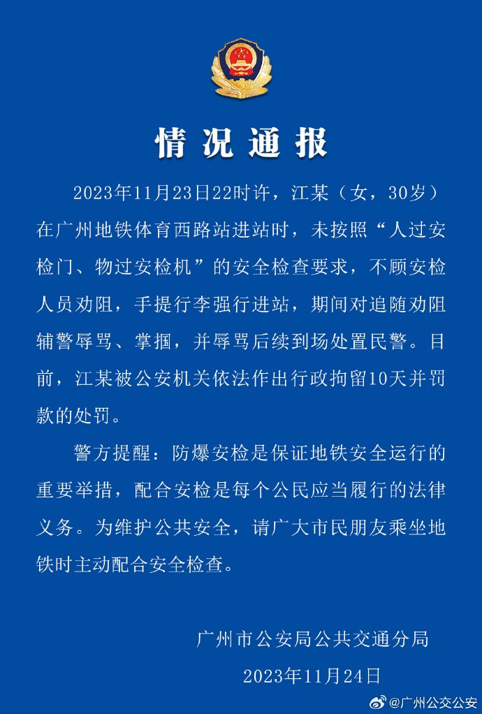 2023年11月23日22时许,江某(女,30岁)在广州地铁体育西路站进站时,未按照“人过安检门、物过安检机”的安全检查要求,不顾安检人员劝阻,手提行李强行进站,期间对追随劝阻辅警辱骂、掌掴,并辱骂后续到场处置民警。目前,江某被公安机关依法作出行政拘留10天并罚款的处罚。