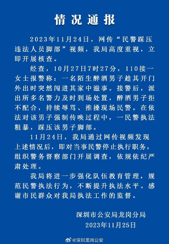 深圳警方通报“民警踩压违法人员脚部”:已停职,严肃处理