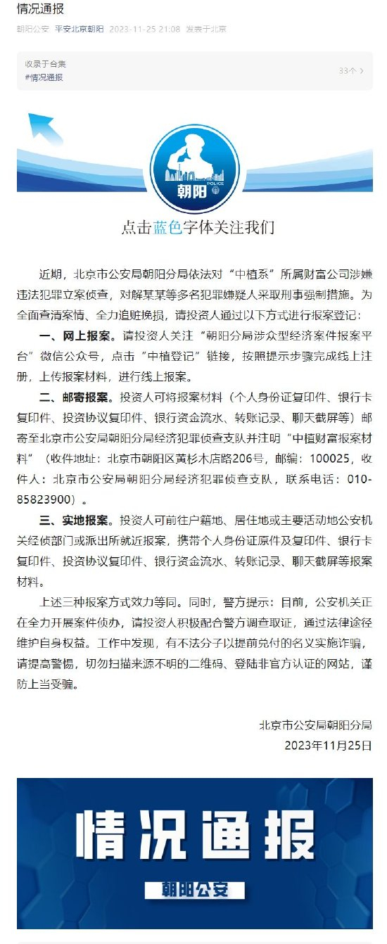平安北京朝阳官微11月25日消息,北京市公安局朝阳分局通报,近期,北京市公安局朝阳分局依法对“中植系”所属财富公司涉嫌违法犯罪立案侦查,对解某某等多名犯罪嫌疑人采取刑事强制措施。为全面查清案情、全力追赃挽损,请投资人通过以下方式进行报案登记: