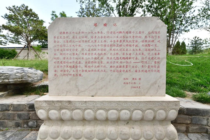 被誉为“一枝塔影认通州”的燃灯塔上,一株塔榆成为不可磨灭的文化符号。至今,这株古老的塔榆依然屹立在西海子公园内。据《塔榆记》记载,清康熙三十七年(1697年),修建古塔之时,榆钱随泥带至瓦垄之间,长出幼树。塔榆靠瓦底薄土生存,顽强拼搏屹立于塔顶近290年。1987年,修缮塔刹时将其精心移植于西海子公园葫芦湖旁。如今“塔榆”树龄320年,为一级古树。这棵曾经生长在燃灯塔顶的奇迹之树,在园林工人的悉心呵护下,已经“吃胖”了好几圈,它不但承载了几代通州人的记忆,更见证了本地的发展与蜕变。