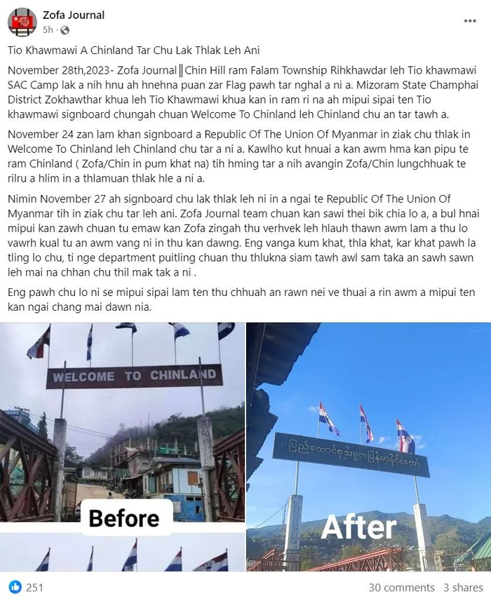就此线索追溯,Zofa Journal在其脸书主页介绍自己为缅甸的日报,主要报道实皆地区和钦邦的新闻,使用的是米佐语,该语言是印度米佐拉姆邦米佐人的母语,属于缅语族库基-钦语支。11月28日中午,Zofa Journal更新了一则消息表示,11月24日晚,Khawmawi地区“缅甸联邦共和国”的标语被改为英文的“欢迎来到钦邦”以及“钦邦”,而11月27日,该招牌再次更改,重新替换为缅甸语的“缅甸联邦共和国”。