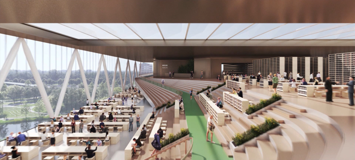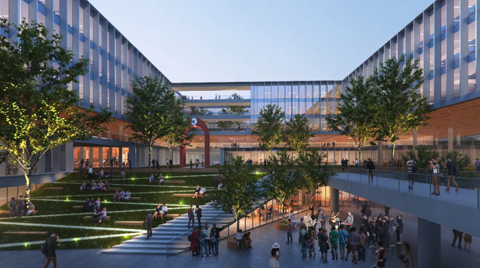 北京科技大学雄安校区占地面积约2450亩,将围绕一条“南北中轴线”规划布局国家级大科学装置。70年前北科大学建校之初,一口“水常满溢,清澈见底,甘甜可口,舀之不竭”的满井曾供应了全校几千人的生活和基建施工用水。为此,新校区将利用“南—中—北”地块的天然格局,构建“井字型”公共生态廊道,形成“南城、中校、北苑”的空间格局,重现学校早期“清泉溢满井”的历史景观。今天,北科大也公布了新校区的第一栋建筑以及第一批项目计划。实验实习保障中心项目为雄安校区的第一栋建筑,位于校园西北角,西侧与北侧临校内道路,东侧临校内二期教学实验厂房,南侧临校内再生资源利用中心;建筑分为三个单体,为学校师生开展实验实习及科学研究提供有力支撑。此外,西南学生宿舍组团、钢铁书院及综合楼组团、再生资源利用中心三个项目被列入第一批项目计划,从已公布的效果图上看,建筑通透漂亮,极具现代感。