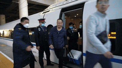医护人员在车站工作人员护送下