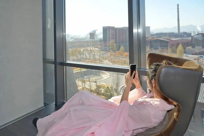 小石提醒:汤泉良子温泉4楼(按摩区与茶歇区)5楼(汤泉和汗蒸广场)6楼(城市会客厅、休息区)都可以清楚地看到大跳台。其中,6楼西侧专门设有大跳台观景区,位置绝佳!