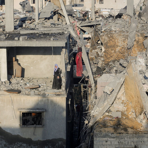 ▲12月6日,在汗尤尼斯,一名巴勒斯坦人查看遭以军空袭后的建筑废墟。图据新华社