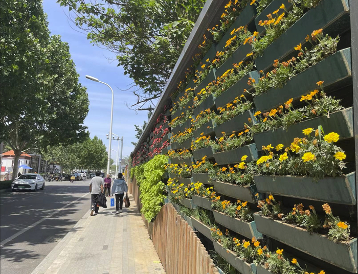 通过背街小巷精细化治理,北苑北路新增两个街头休憩公园及一面立体绿化展示墙,道路北端设置休闲廊架及休憩座椅,同时打造了“微口袋花园”。