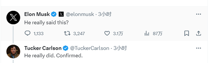 卡尔森这条帖文引发大量网民讨论,包括美知名企业家马斯克。马斯克留言问道,“他真这么说了?”卡尔森回复称,“他真这么说了。已证实。”↓
