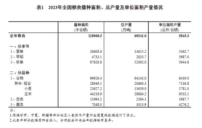 三、全国粮食总产量69541万吨(13908亿斤),比2022年增加888万吨(178亿斤),增长1.3%。其中谷物产量64143万吨(12829亿斤),比2022年增加819万吨(164亿斤),增长1.3%。