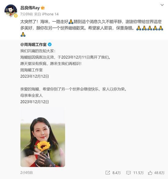 吕良伟发文悼念周海媚: 听到这个消息久久不能平静