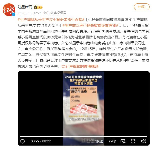 [小杨哥直播间被指卖冒牌货 生产商称从未生产过 市监介入调查]近日,小杨哥带货牛肉卷被质疑产品有问题一事引发网络关注。红星新闻调查发现,受关注的牛肉卷系小杨哥直播间以89.9元4斤价格为湖北某品牌电商售卖的产品。有消费者在小杨哥授权账号购买了牛肉卷,外包装显示牛肉卷由电商委托山东一家肉制品公司生产。电商公司称,委托手续是齐全的。