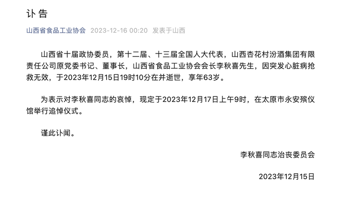 新京报讯(记者秦胜南)12月16日0时许,山西省食品工业协会在官方微信公众号发布讣告,山西省十届政协委员,第十二届、十三届全国人大代表,山西杏花村汾酒集团有限责任公司原党委书记、董事长,山西省食品工业协会会长李秋喜,因突发心脏病抢救无效,于2023年12月15日19时10分逝世,享年63岁。