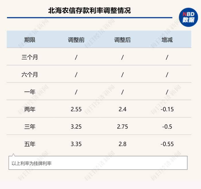 岁末年初,中小银行存款利率有升有降。部分中小银行继续下调存款利率,12月12日,北海农信发布消息称,自12月15日起,下调二年、三年和五年期存款挂牌利率。