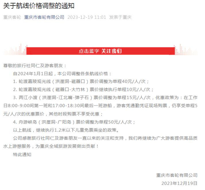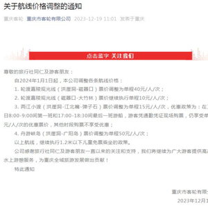 12月19日,重庆市客轮有限公司发布消息称,自2024年1月1日起,将对轮渡嘉陵观光线、两江小渡、舟游峡岛等航线价格进行调整。具体来看: