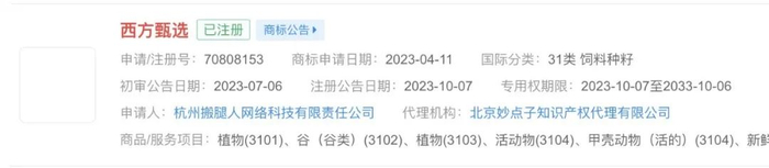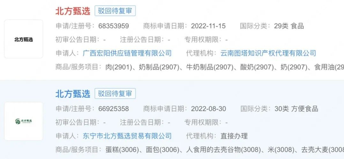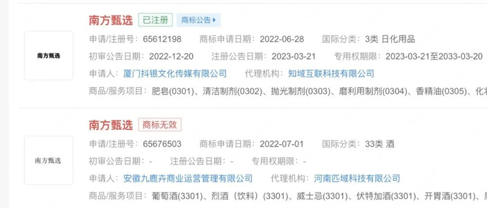 此外,“西方甄选”“南方甄选”“北方甄选”“董宇辉”等商标也被多家公司申请注册,国际分类涉及方便食品、餐饮住宿、广告销售等,其中杭州某公司申请的“西方甄选”和厦门某公司申请的商标“南方甄选”部分已注册成功,其他商标申请多被驳回或无效状态。