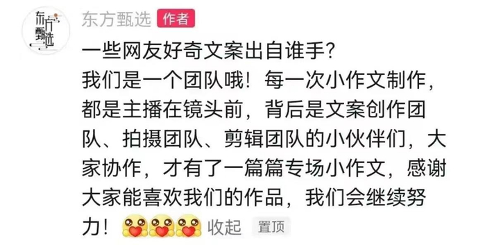 12月6日,东方甄选抖音小编在一则宣传视频下方留言,言辞之中暗示董宇辉的直播文案并非由本人创作,而是团队创作。这番言论受到网友争议,但并未引起太多关注。