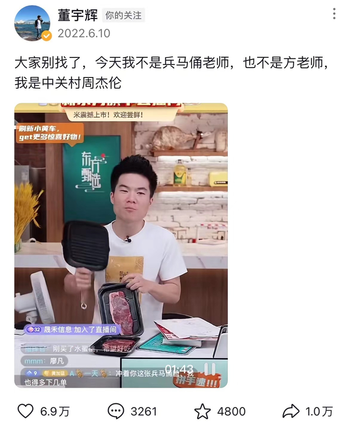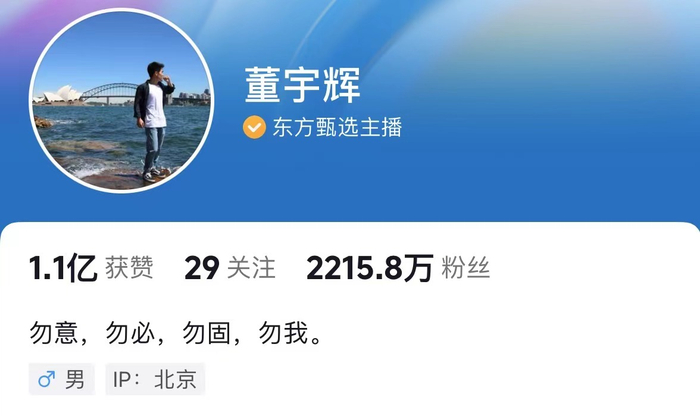 不过,外界的感受是,从2022年9月出圈走红以来,东方甄选和董宇辉之间的关系日渐微妙。董宇辉曾在直播中坦言,自己连新东方30周年年会的门票都没有,是俞敏洪知道后,才给了他一张门票。荣升高管什么的也是子虚乌有,自己就是一个普通主播。