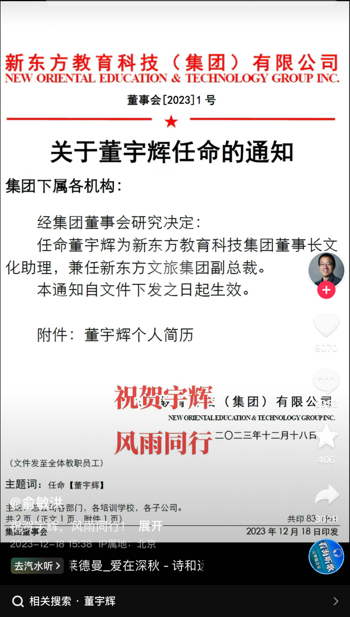 就在一天时间里,董宇辉不再是“售货员”,如今他拥有三个新身份:“东方甄选高级合伙人”“新东方教育科技集团董事长文化助理”和“新东方文旅集团副总裁”。