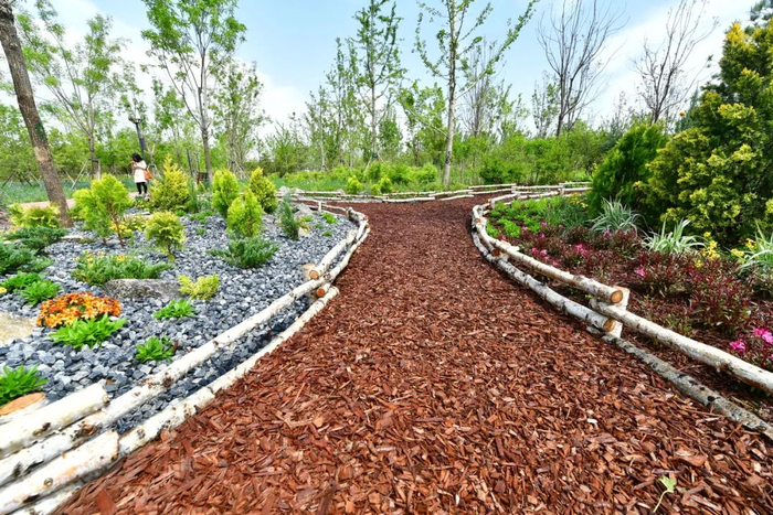 穿行在城市副中心主干道和各个公园,驻足仔细观察,不难发现不少树下都有这些彩色木质覆盖物,它们都是从园林绿化废弃物处理站生产而来。这些彩色有机覆盖物的作用不仅是美观,碎木块相互堆积交错连接成一个整体,在冬季严寒的正常风力下也不会被风吹走,可以起到裸露覆盖、抑制扬尘等多种功能。其所用的染料也是利用矿物元素本身的天然色彩调配而成,没有任何化学添加剂,一定程度上还能为土壤补充矿质元素。